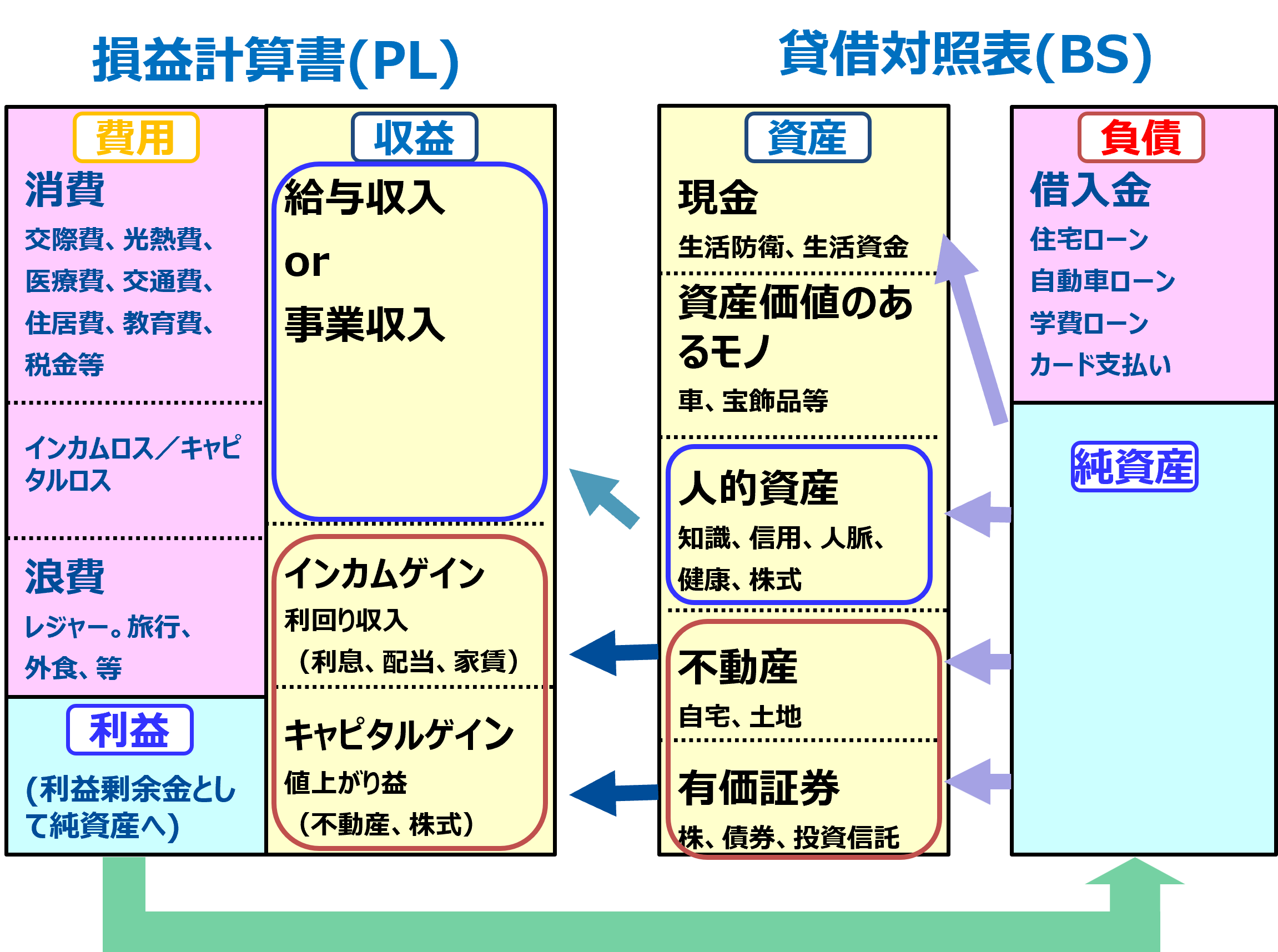 書き直しながら、「収益」「費用」「利益」「資産」「負債」「純資産」これらの会計の損益計算書(PL)や貸借対照表(BS)に出てくる考え方を家計に当てはめると、