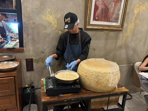 横のでっかいチーズを削りながらの調理を見学しながらの食事です